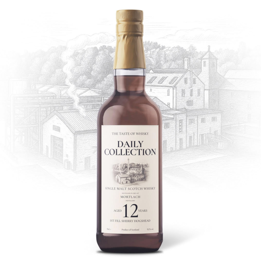W czasach kiedy w restauracjach McDonald’s wraca menu z lat 2000, Anita Lipnicka z refrenem z “Pocałuj Noc” z 1995 roku dogrywa się na albumie PRO8L3Mu, my robimy mały krok dla człowieka, ale wielki dla świata whisky i reaktywujemy serię Daily Collection! Nie bylibyśmy sobą, gdyby ta reaktywacja nie odbyła się po naszemu, czyli trochę jak u Hitchcocka. Rozpoczynamy bestią z Dufftown, 12-letnią Mortlach, która beczką 1st fill Sherry Oloroso debiutuje w naszym portfolio. O oprawę artystyczną nowej odsłony tak lubianej przez Was serii zadbał niezastąpiony Michał Kortas z Lemon-art Studio Graficzne, czyli najlepszy ekspert od etykiet na polskim rynku – jak zwykle Michale dziękujemy i kłaniamy się nisko za włożoną pracę. Inspiracją dla nas podczas tworzenia nowej etykiety Daily Collection były oczywiście butelkowania z minionych epok, z czasów, kiedy whisky broniła się zawartością butelki, a etykiety zawierały minimum niezbędnych danych potrzebnych do wyboru tej właściwej.